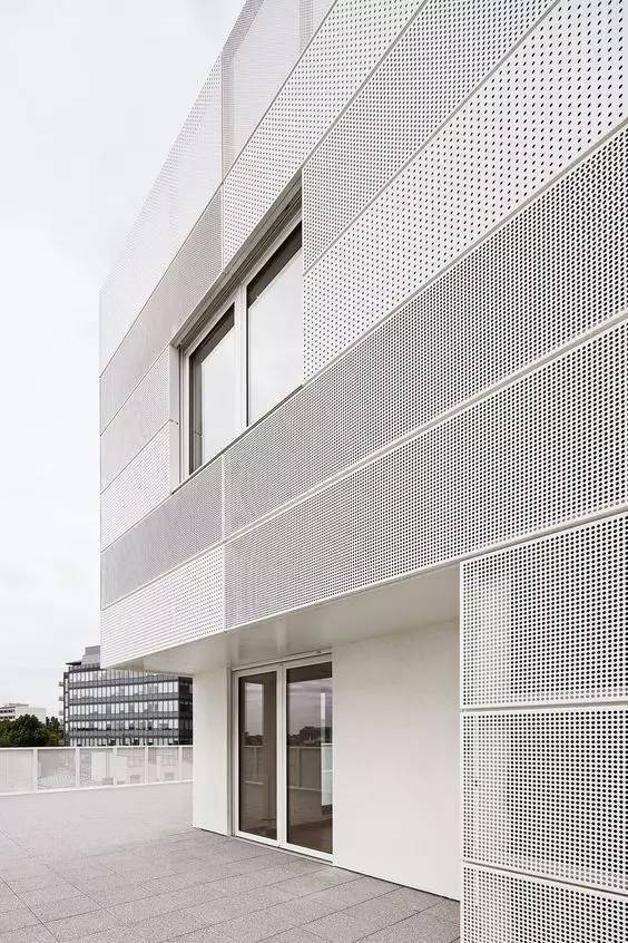 小編認(rèn)為穿孔鋁板以完整統(tǒng)一的材料語(yǔ)言覆蓋建筑表皮,可以增強(qiáng)公共建筑的整體性和純粹性,形成簡(jiǎn)潔、明確、肯定的外部形象,創(chuàng)造感官直接強(qiáng)烈的感染力。在建筑中,穿孔鋁板表皮可遮擋建筑界面不規(guī)則的開(kāi)窗,統(tǒng)一建筑語(yǔ)言,與其他材料共同構(gòu)成均質(zhì)的立面,豐富表皮的肌理與層次。
