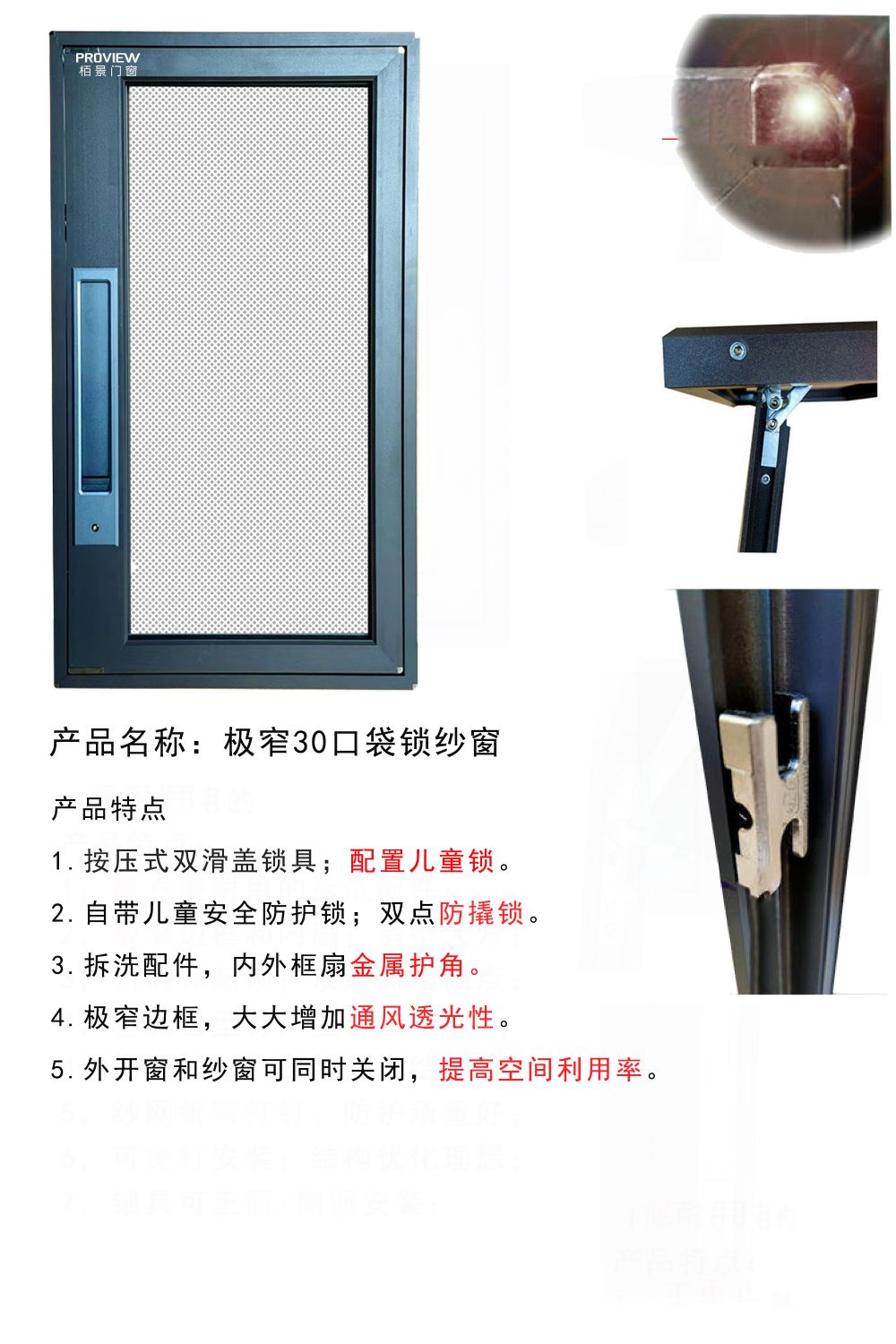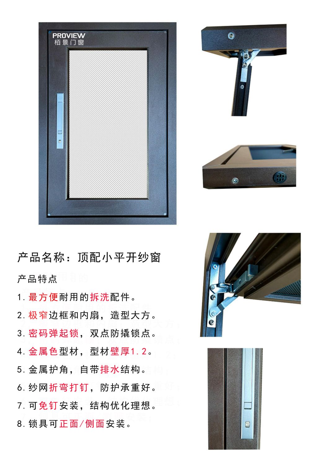 • 外框不銹鋼銷釘組角工藝,外看面無凹槽確保整體性,小邊框設(shè)計,不妨礙原窗排水功能。